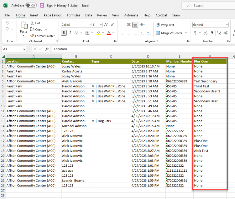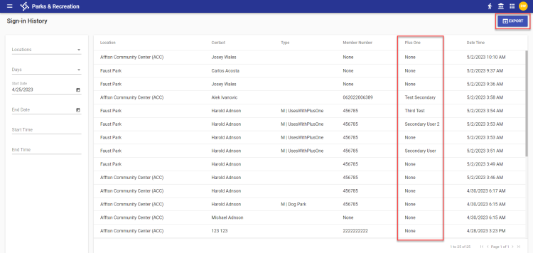A Plus One column also has been added to the Sign-In History page and the history export. If a membership is not a plus-one membership, None displays in the column: