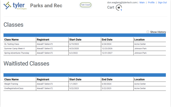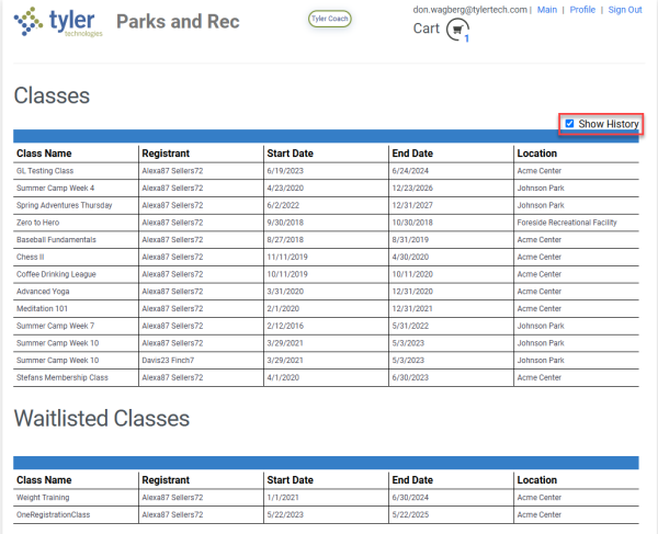 Marking the Show History checkbox displays past classes: