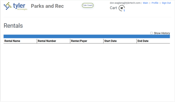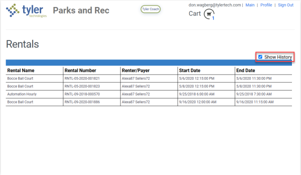 Marking the Show History checkbox displays past rentals: