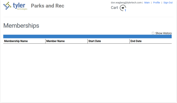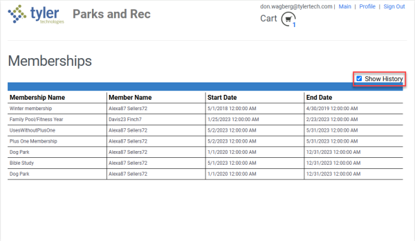 Marking the Show History checkbox displays past memberships: