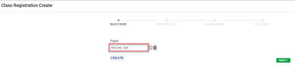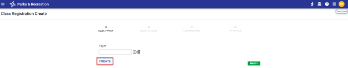 A CREATE button has been added to the SELECT PAYER step of the class registration process: