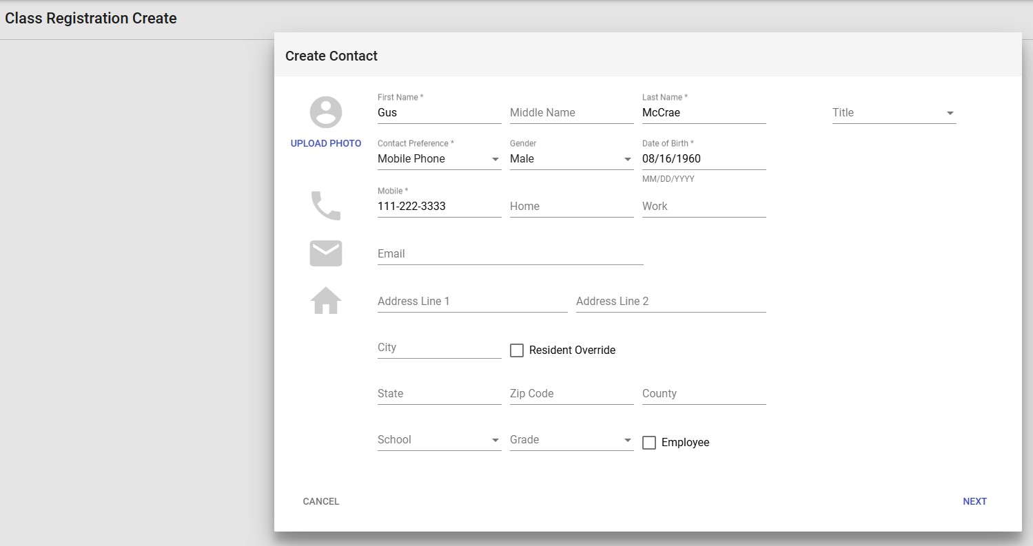 Fill in the contact's information and click NEXT to create the contact's record and auto-fill the Payer field with the contact's name: