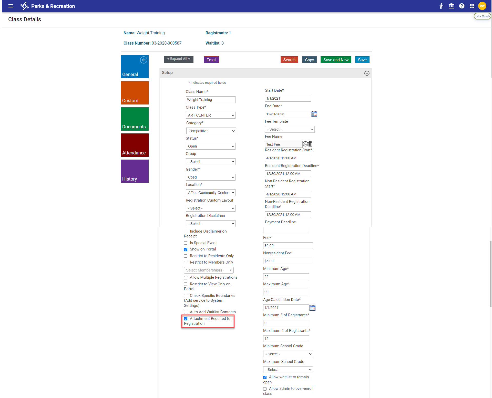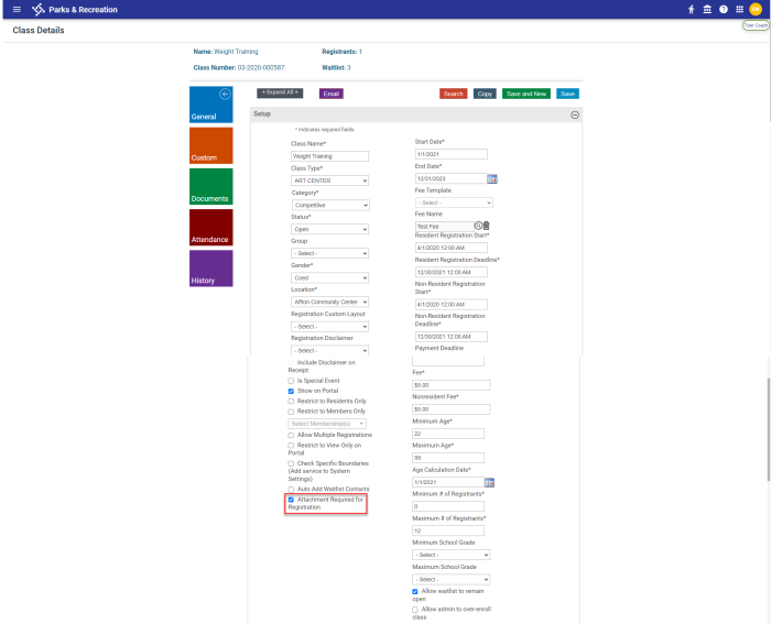 A new setting, Attachment Required for Registration, has been added to the Class Details page: