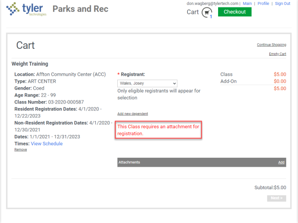 Marking this checkbox enforces the adding of attachments during registration for the class from the citizen portal: