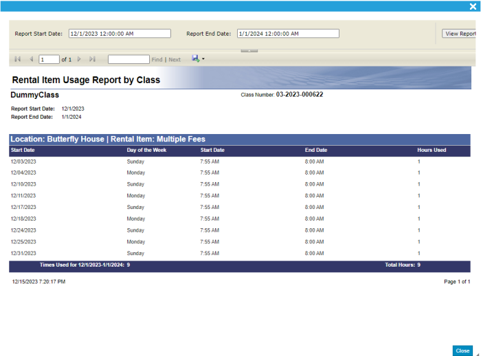 Rental Item Usage Report by Class